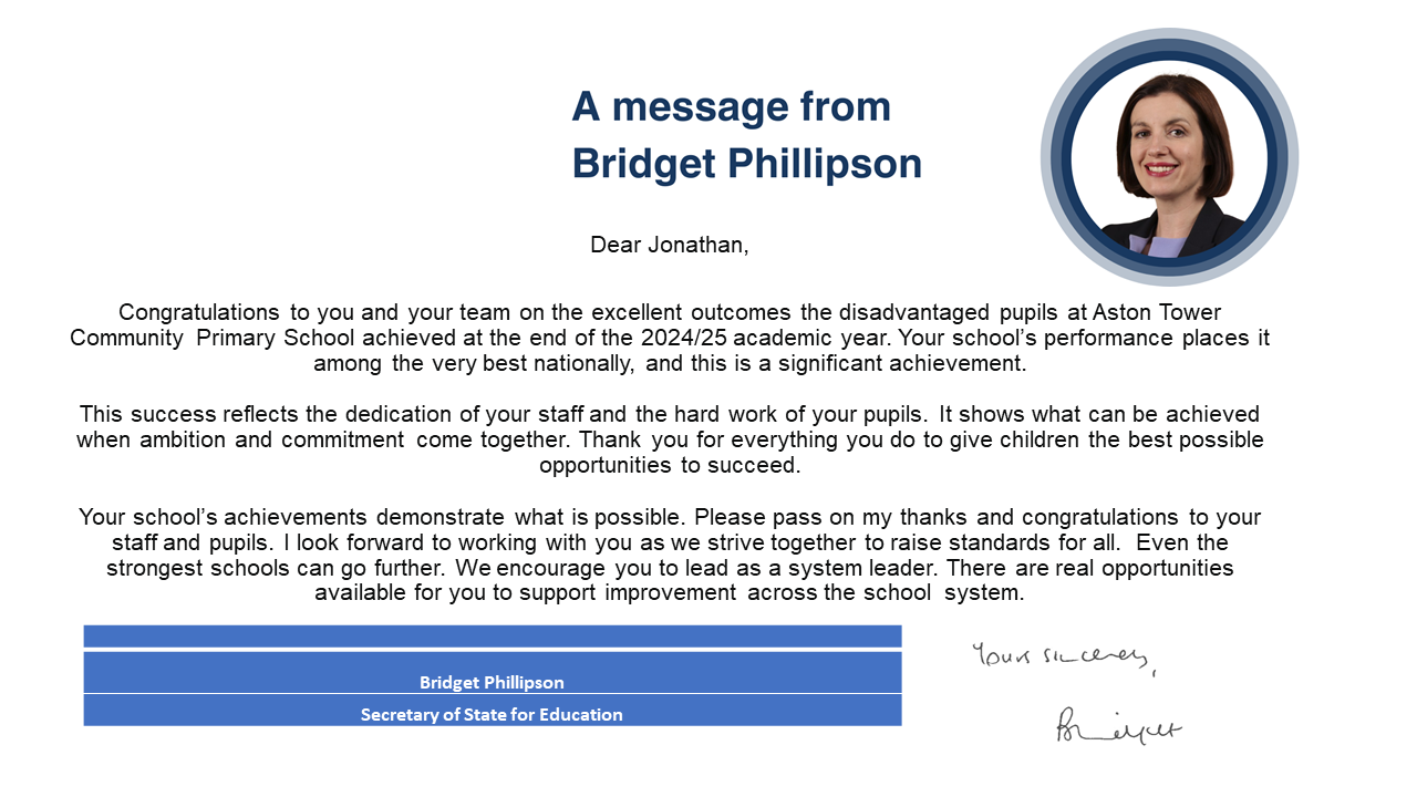 We hope our website will give you an exciting flavour of our school. At Aston Tower we achieve excellence - this is our mission statement - a message that our pupils wear on their uniform with pride underneath the school badge. Excellence is a feature of our school and something we seek to achieve in everything we do. For example, inspectors keep saying that the behaviour of our pupils is outstanding. The teaching is outstanding too. We want our pupils to achieve excellence in all areas of school life to help them lead successful lives as adults.